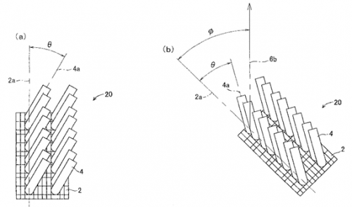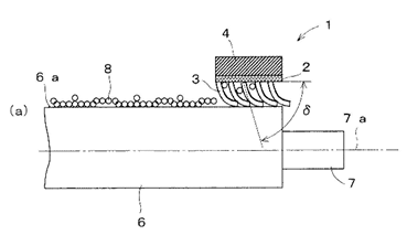 1E: 使用状態では、回転体の回転方向に対し、該配列の方向が該予め定める角度θよりも大きな角度φをなすように、該配列の方向を該回転方向に対して傾斜させることを特徴とする