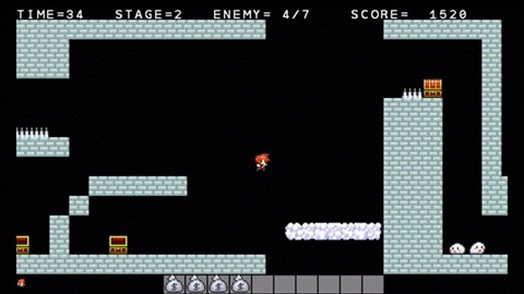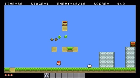 このほかにも、キャラと壁との当たり判定、敵の移動処理、ステージクリア条件の設定など、組み込むべき処理は盛りだくさんです。マリオのように、ブロックをジャンプで壊せるようにもしたかったので、そのあたりの処理も苦労して実装しました。生成AIも使いましたが、マイナーな言語のため、そのまま動くようなソースを書いてくれることはありませんでした(アルゴリズムの相談にはずいぶん乗ってもらいました)。